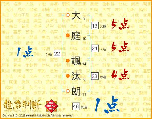 大(3画)庭(10画) 颯(14画)汰(8画)朗(11画)