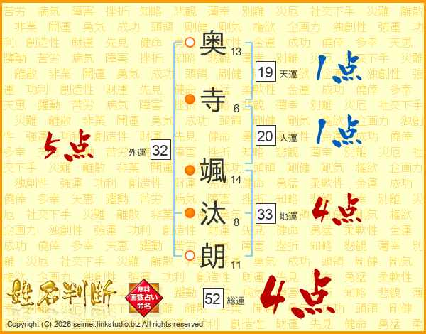 奥(13画)寺(6画) 颯(14画)汰(8画)朗(11画)