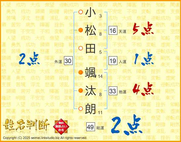 小(3画)松(8画)田(5画) 颯(14画)汰(8画)朗(11画)