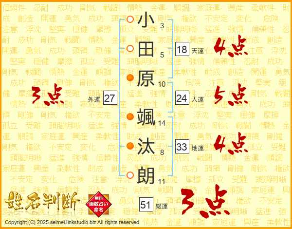 小(3画)田(5画)原(10画) 颯(14画)汰(8画)朗(11画)