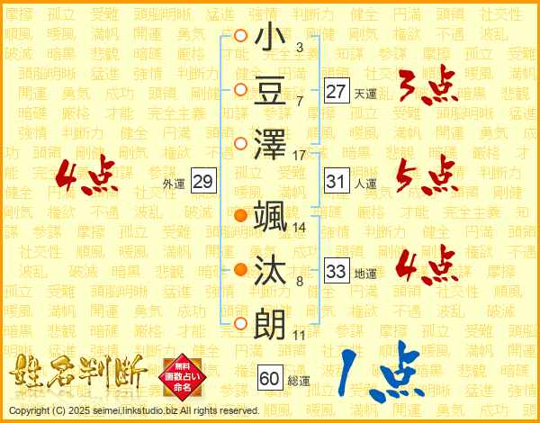 小(3画)豆(7画)澤(17画) 颯(14画)汰(8画)朗(11画)