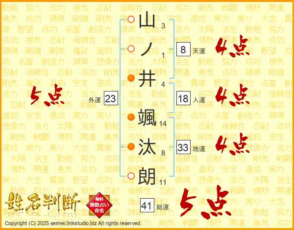 山(3画)ノ(1画)井(4画) 颯(14画)汰(8画)朗(11画)