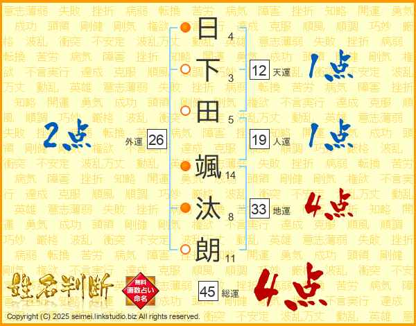 日(4画)下(3画)田(5画) 颯(14画)汰(8画)朗(11画)