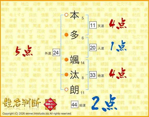 本(5画)多(6画) 颯(14画)汰(8画)朗(11画)