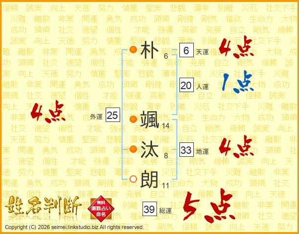 朴(6画) 颯(14画)汰(8画)朗(11画)
