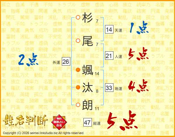 杉(7画)尾(7画) 颯(14画)汰(8画)朗(11画)