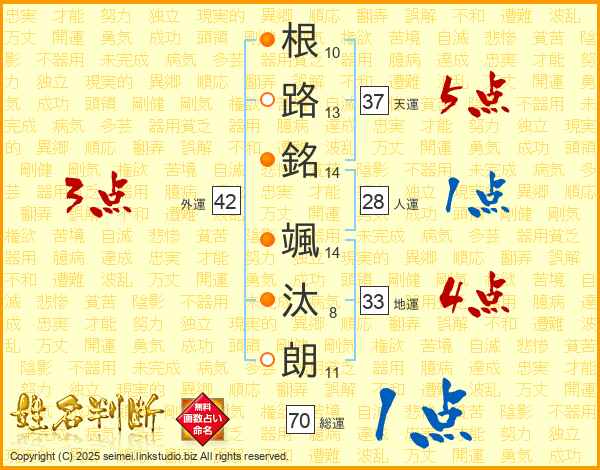 根(10画)路(13画)銘(14画) 颯(14画)汰(8画)朗(11画)