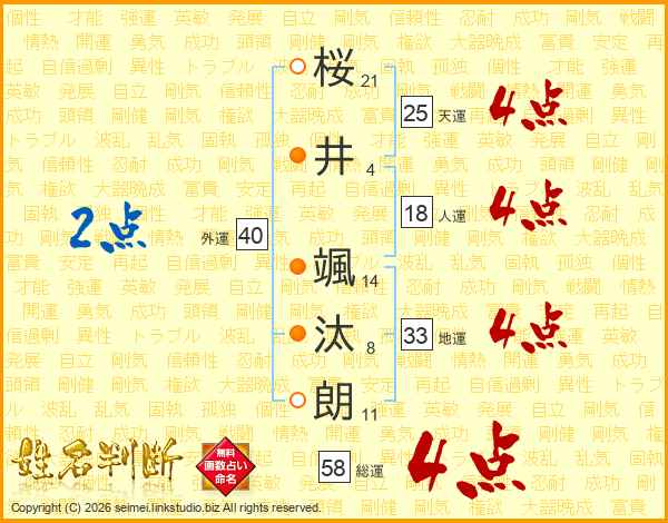 桜(21画)井(4画) 颯(14画)汰(8画)朗(11画)