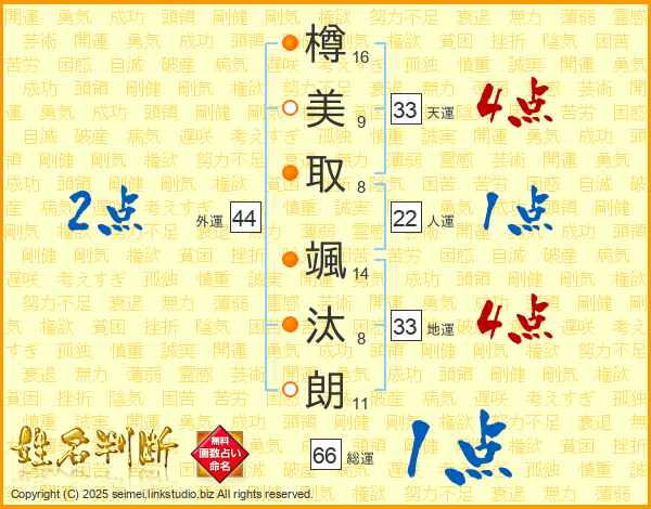 樽(16画)美(9画)取(8画) 颯(14画)汰(8画)朗(11画)