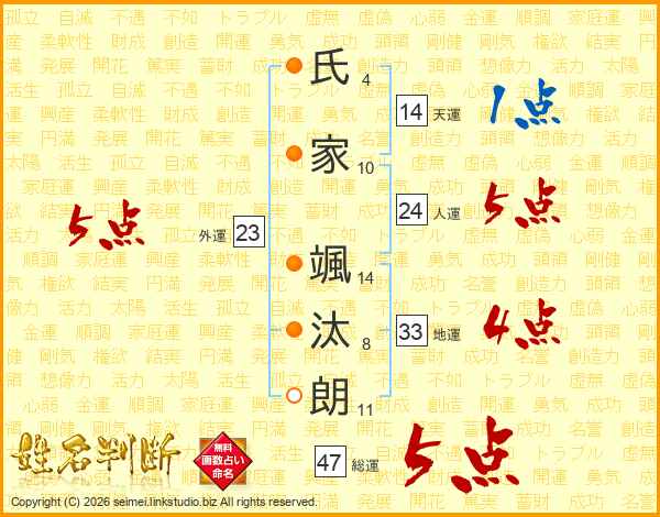 氏(4画)家(10画) 颯(14画)汰(8画)朗(11画)