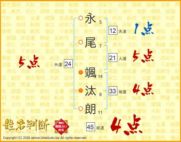 永(5画)尾(7画) 颯(14画)汰(8画)朗(11画)
