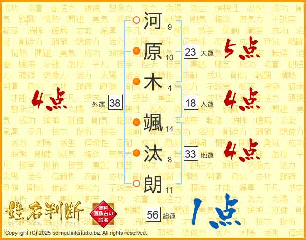 河(9画)原(10画)木(4画) 颯(14画)汰(8画)朗(11画)