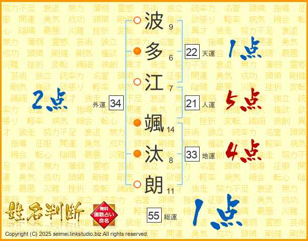 波(9画)多(6画)江(7画) 颯(14画)汰(8画)朗(11画)