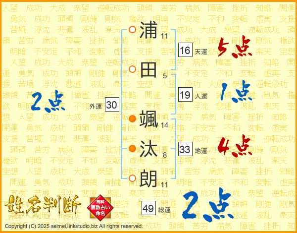 浦(11画)田(5画) 颯(14画)汰(8画)朗(11画)