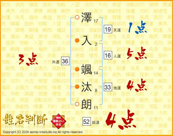澤(17画)入(2画) 颯(14画)汰(8画)朗(11画)