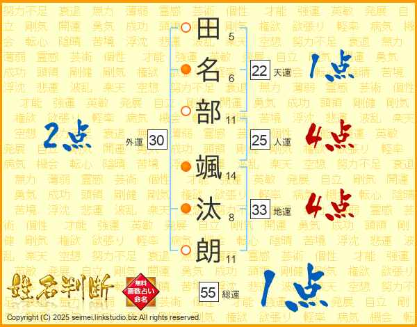 田(5画)名(6画)部(11画) 颯(14画)汰(8画)朗(11画)