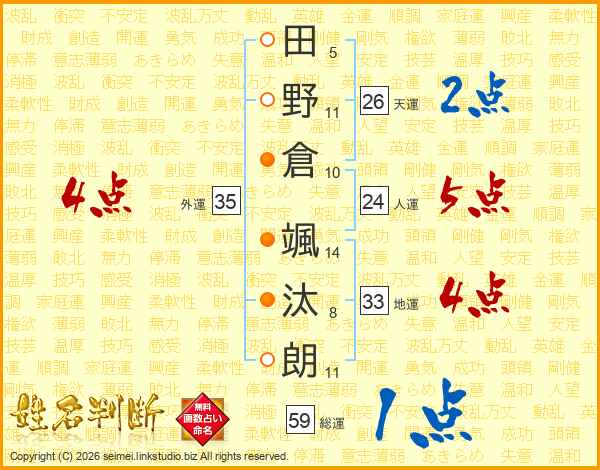 田(5画)野(11画)倉(10画) 颯(14画)汰(8画)朗(11画)