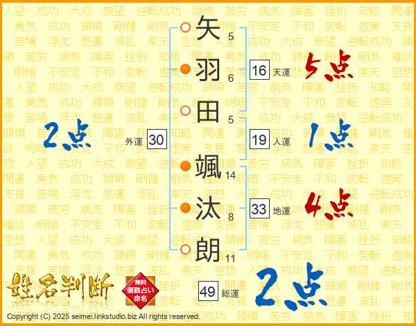 矢(5画)羽(6画)田(5画) 颯(14画)汰(8画)朗(11画)