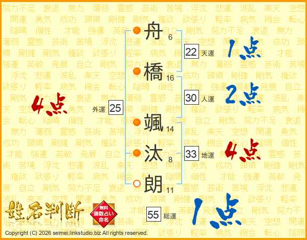 舟(6画)橋(16画) 颯(14画)汰(8画)朗(11画)