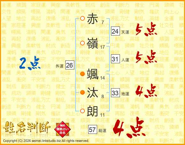 赤嶺颯汰朗さんの総運は57画の4点!