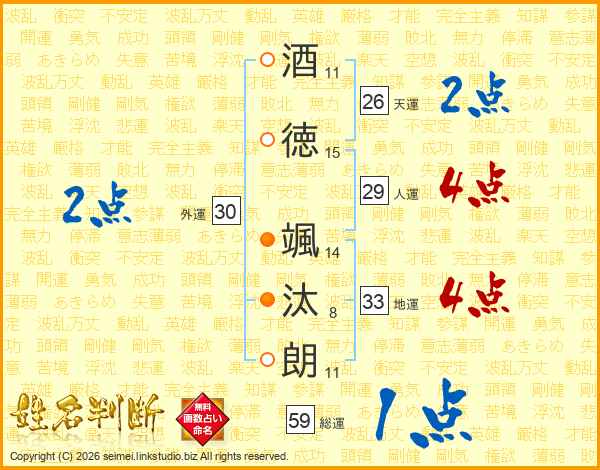 酒(11画)徳(15画) 颯(14画)汰(8画)朗(11画)
