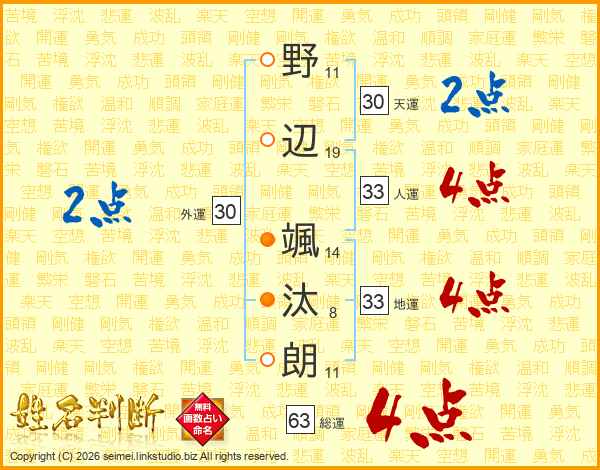 野(11画)辺(19画) 颯(14画)汰(8画)朗(11画)