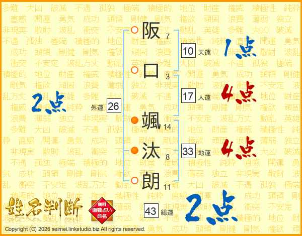 阪(7画)口(3画) 颯(14画)汰(8画)朗(11画)