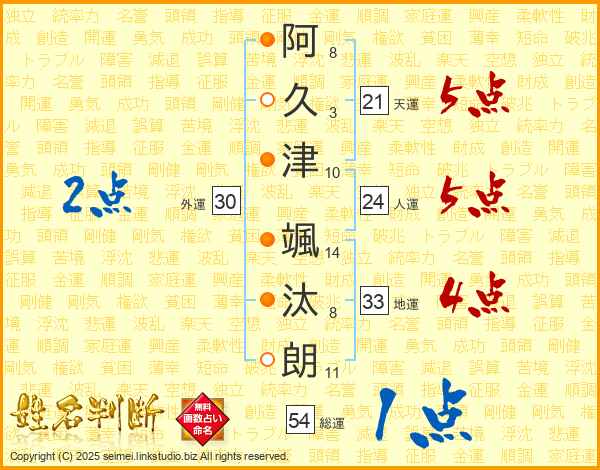 阿(8画)久(3画)津(10画) 颯(14画)汰(8画)朗(11画)
