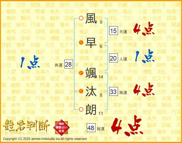 風(9画)早(6画) 颯(14画)汰(8画)朗(11画)