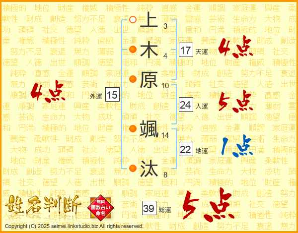 上(3画)木(4画)原(10画) 颯(14画)汰(8画)