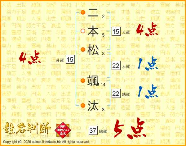 二(2画)本(5画)松(8画) 颯(14画)汰(8画)