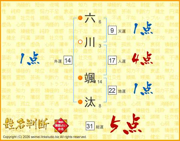 生活面を象徴する運勢です。外部から受ける影響力を表し、結婚運、家庭運や職場、環境への順応性を表します。総運から人運を引いた画数。姓や名が1文字の場合を除く。