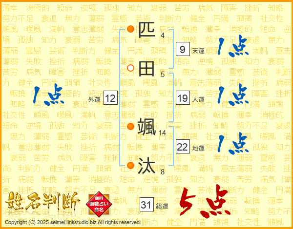 匹(4画)田(5画) 颯(14画)汰(8画)