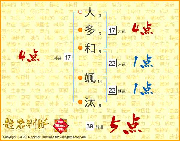 大(3画)多(6画)和(8画) 颯(14画)汰(8画)