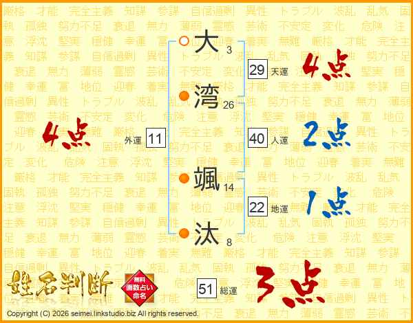 大(3画)湾(26画) 颯(14画)汰(8画)