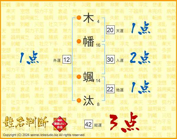 木(4画)幡(16画) 颯(14画)汰(8画)