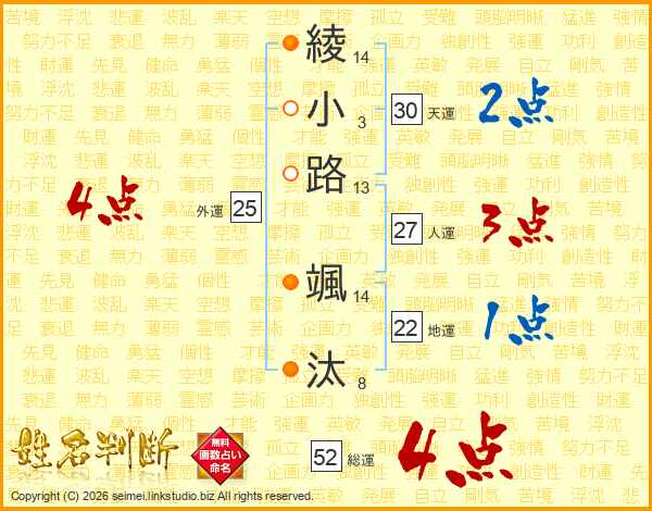綾(14画)小(3画)路(13画) 颯(14画)汰(8画)