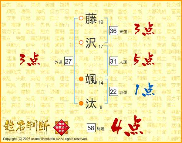 藤(19画)沢(17画) 颯(14画)汰(8画)