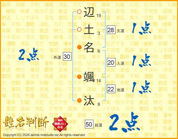 辺(19画)土(3画)名(6画) 颯(14画)汰(8画)