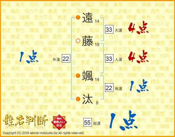 遠(14画)藤(19画) 颯(14画)汰(8画)