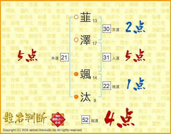 韮澤颯汰さんの総運は52画の4点!