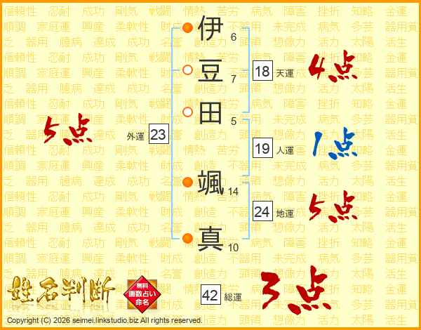 伊(6画)豆(7画)田(5画) 颯(14画)真(10画)