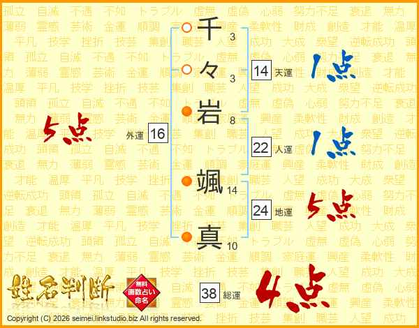千(3画)々(3画)岩(8画) 颯(14画)真(10画)