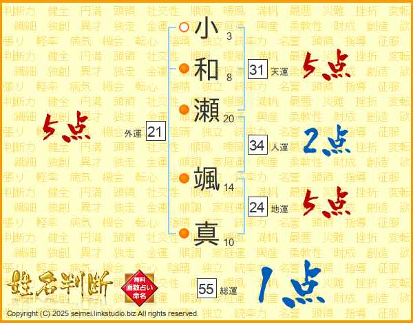 小(3画)和(8画)瀬(20画) 颯(14画)真(10画)