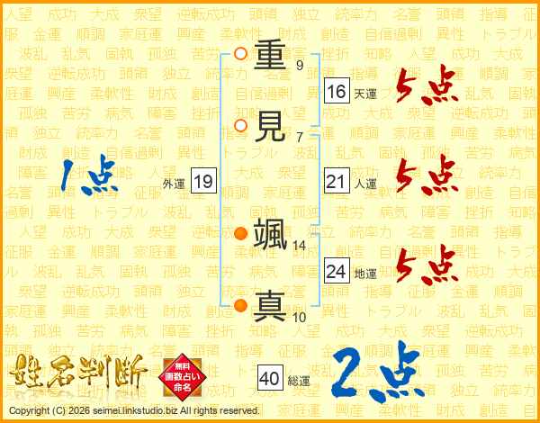 生活面を象徴する運勢です。外部から受ける影響力を表し、結婚運、家庭運や職場、環境への順応性を表します。総運から人運を引いた画数。姓や名が1文字の場合を除く。