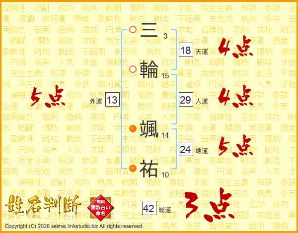 三(3画)輪(15画) 颯(14画)祐(10画)