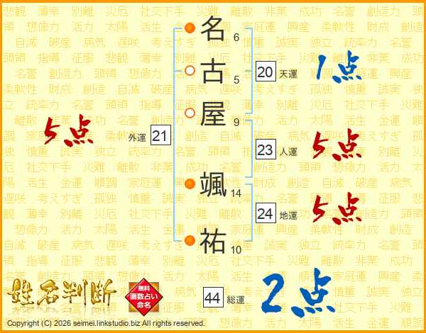 名(6画)古(5画)屋(9画) 颯(14画)祐(10画)