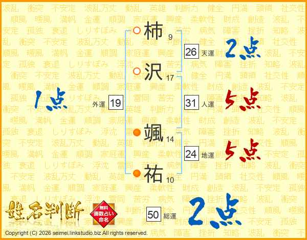 柿(9画)沢(17画) 颯(14画)祐(10画)