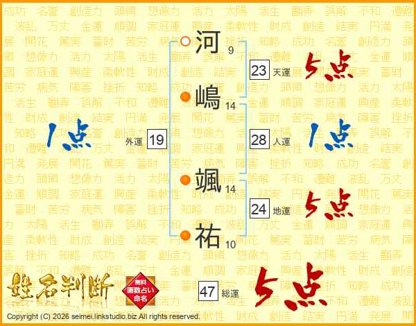 河(9画)嶋(14画) 颯(14画)祐(10画)
