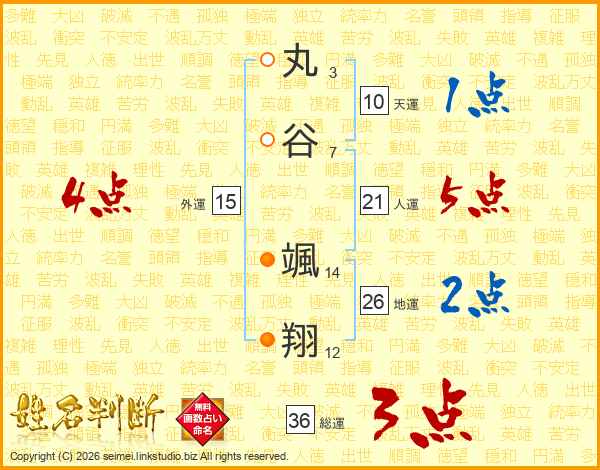 丸(3画)谷(7画) 颯(14画)翔(12画)